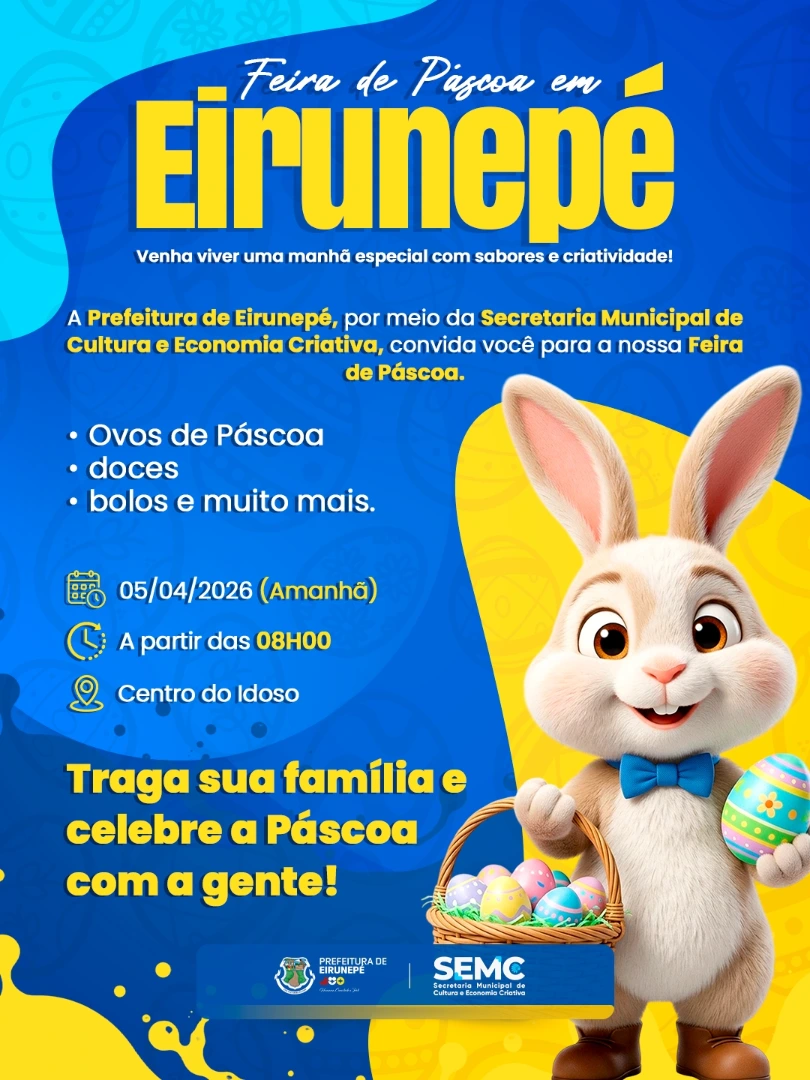 Vem aí a Feira de Páscoa de Eirunepé! Prefeitura convida população para evento especial neste domingo (05) abril 5, 2026